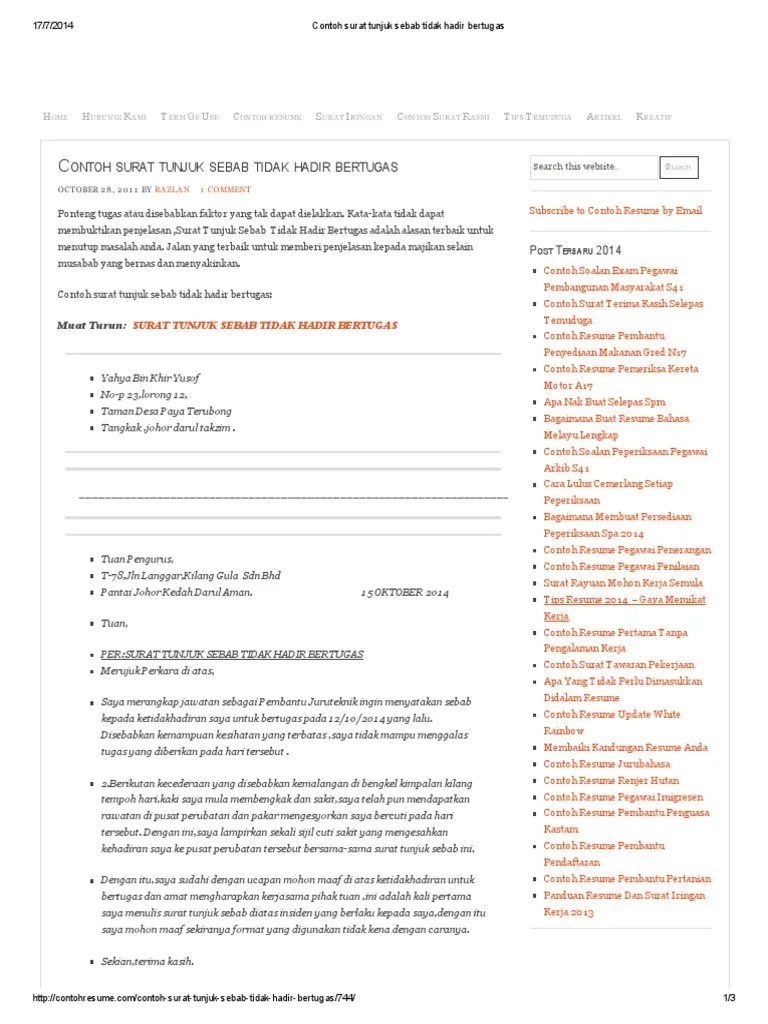 Berdasarkan rekod laporan tams, tuan telah didapati tidak hadir bertugas tanpa cuti atau tanpa terlebih dahulu mendapatkan kebenaran atau tanpa sebab yang . Contoh surat tidak hadir ke sekolah yang rasmi untuk cuti 22 march 2020 15 . Contoh surat tunjuk sebab mudah dan ringkas, surat tunjuk sebab, surat tunjuk sebab tidak hadir bertugas, surat tunjuk sebab tidak hadir mesyuarat, . Ponteng tugas atau disebabkan faktor yang tak dapat dielakkan. Jika ada masalah, boleh gunakan contoh surat tunjuk sebab tidak hadir kerja atau sekolah / lewat datang kerja, ramai dah copy mudah .